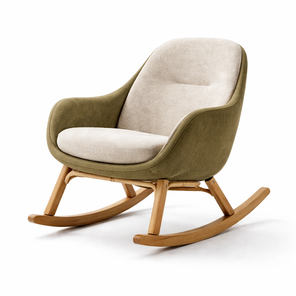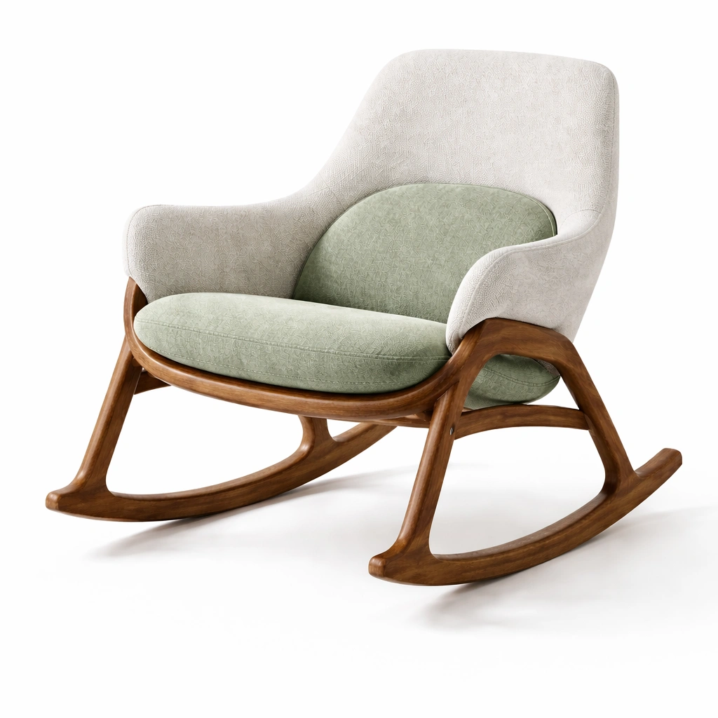 Silla mecedora de tela verde y beige con estructura de madera de haya