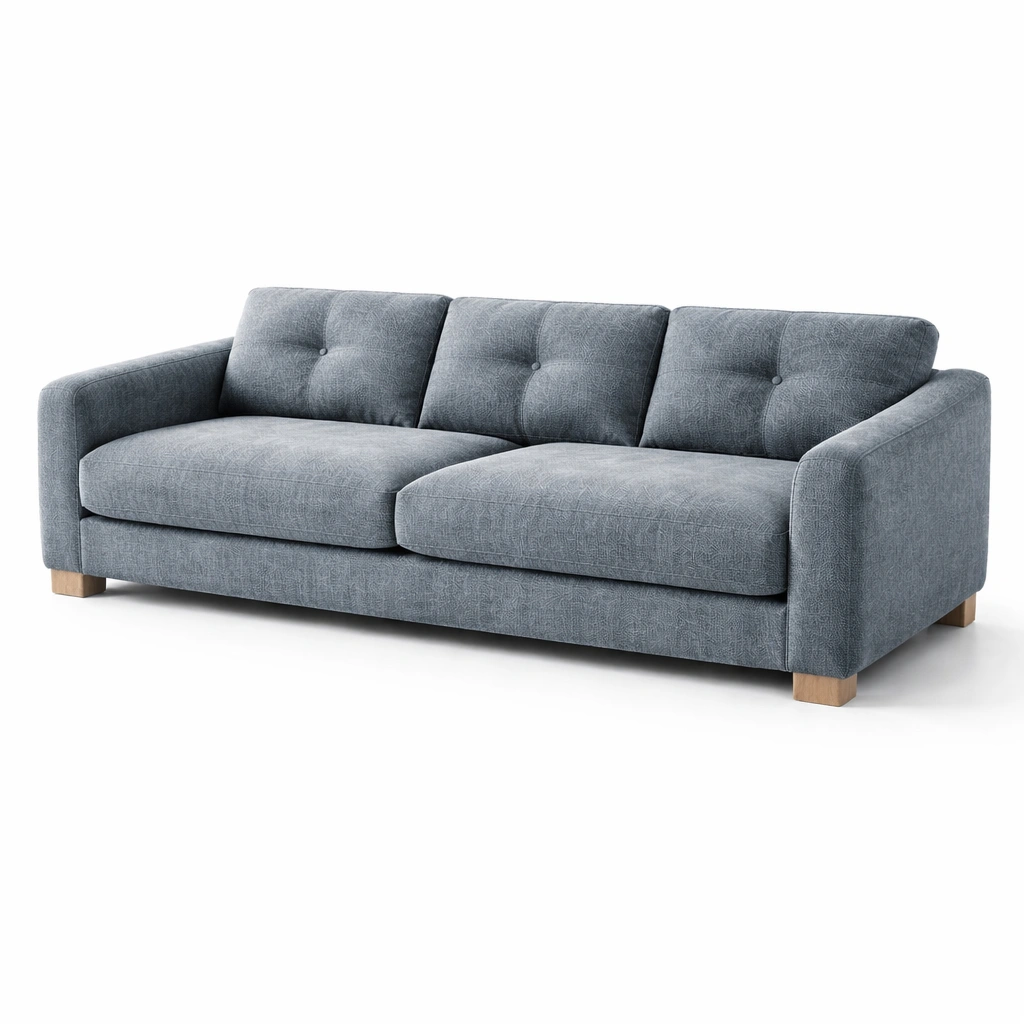 Sofá tapizado en tela beige con patas de madera de tres plazas