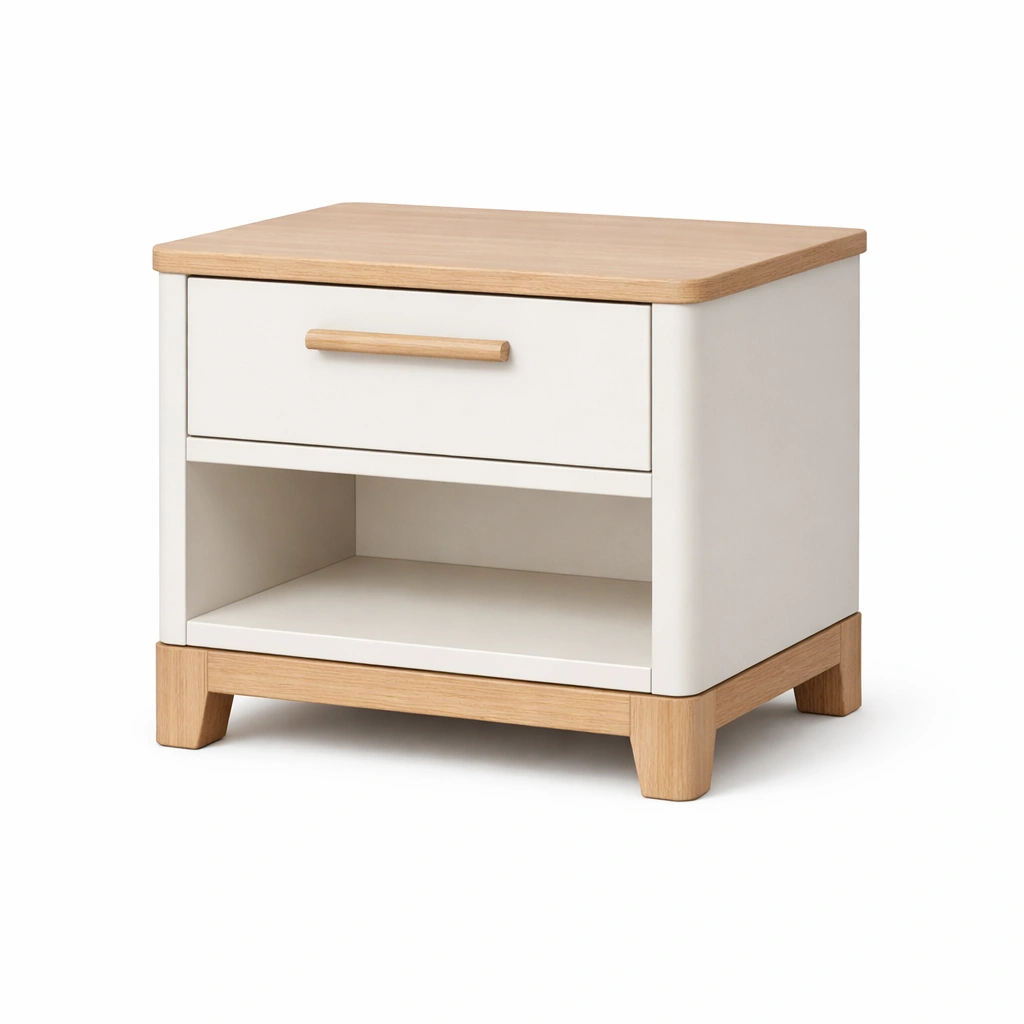 Mesita de noche con diseño contemporáneo equipada con un cajón y un estante abierto para almacenamiento.
